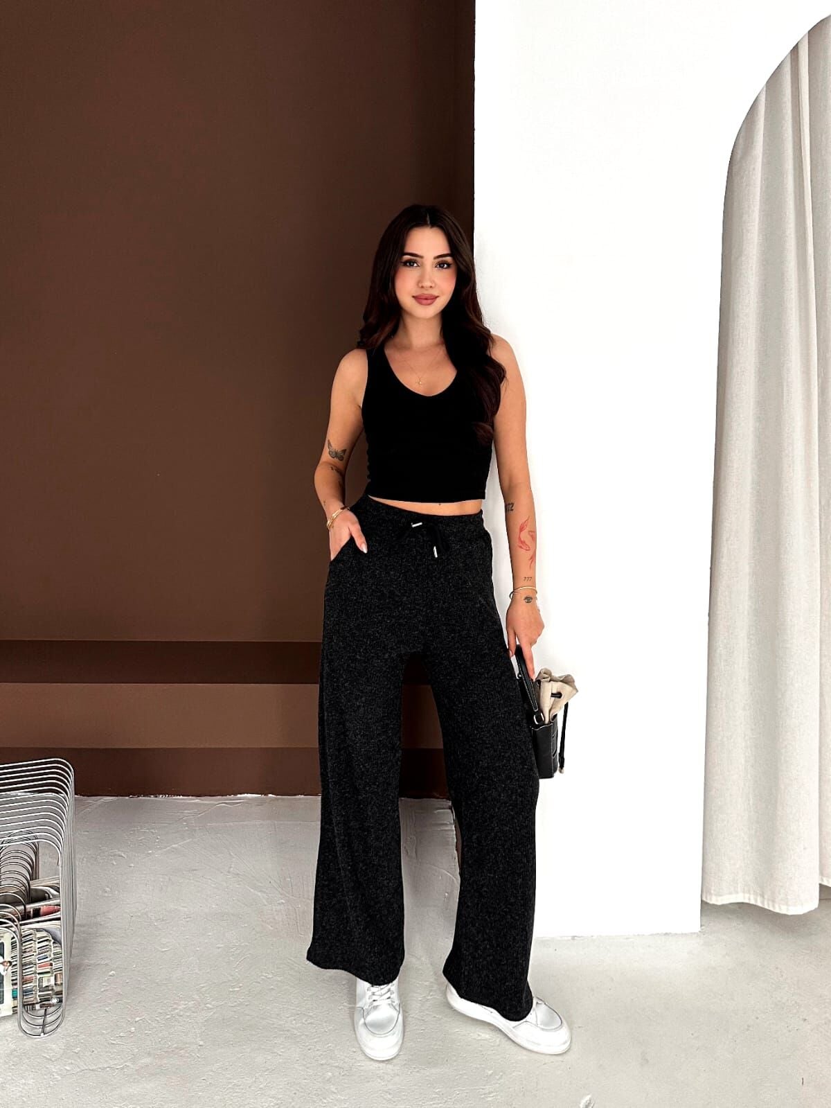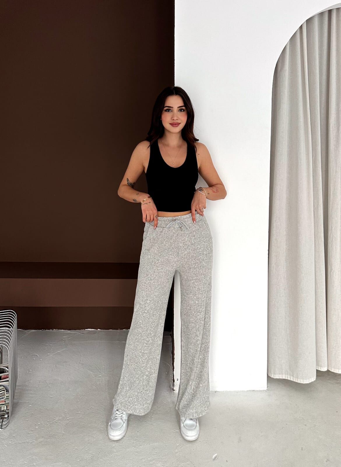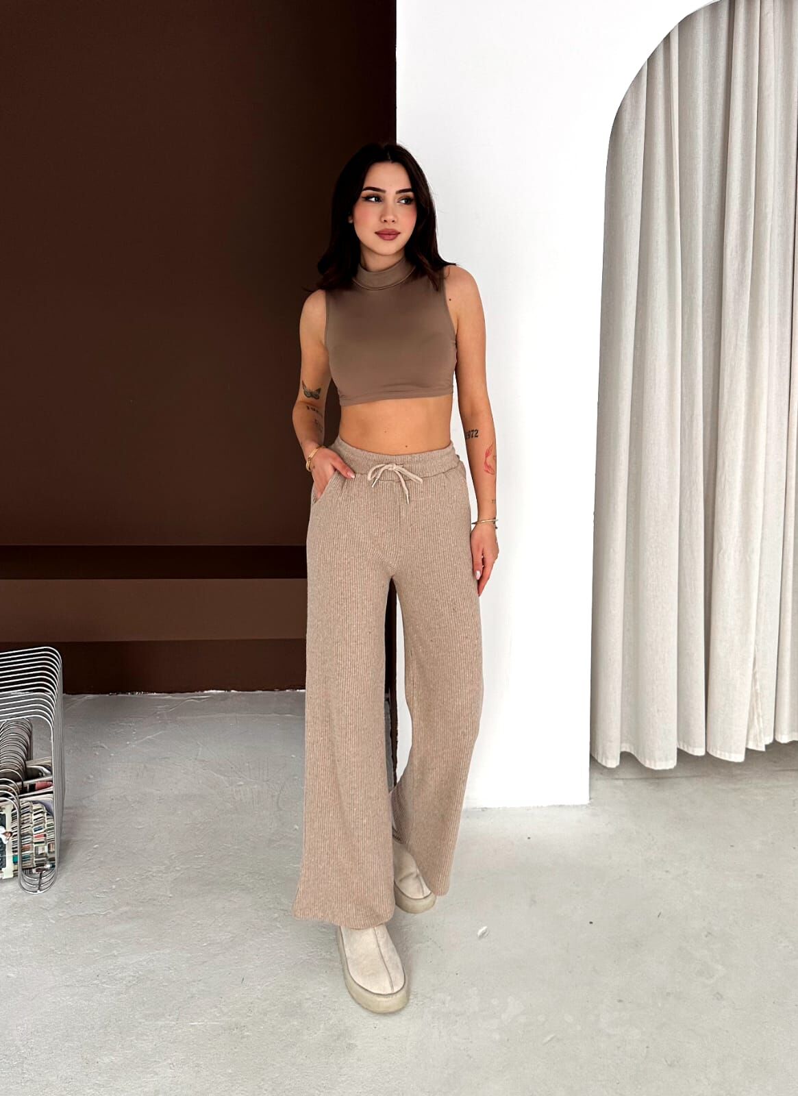 Rahatlık ve şıklığı bir araya getiren fitilli triko palazzo pantolon, gün boyu konfor sunan pamuklu dokusuyla öne çıkar. Bol paça kesimi sayesinde modern ve akıcı bir siluet oluştururken, beli ipli ve ayarlanabilir lastik detayı vücuda mükemmel uyum sağlar.