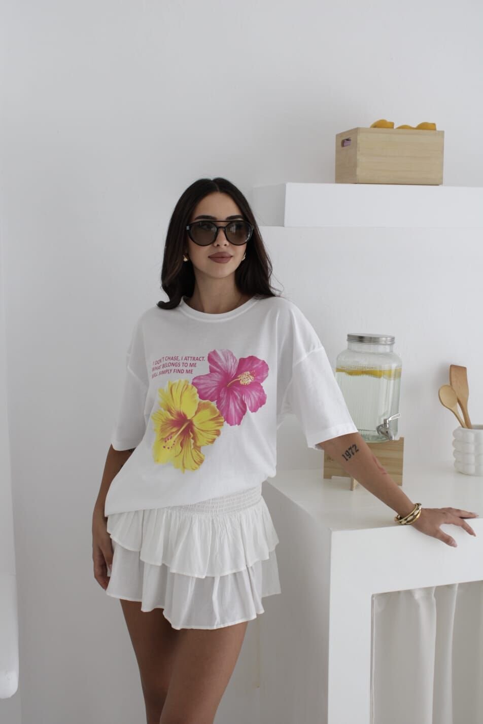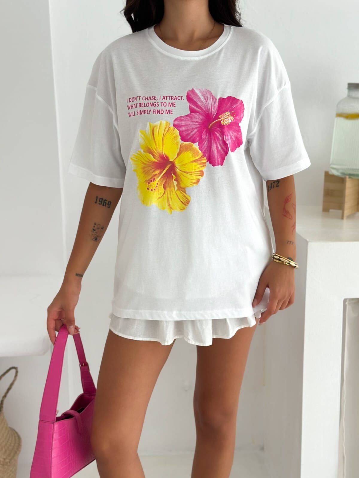 Hibiscus Baskılı Oversize T-Shirt %100 Pamuklu